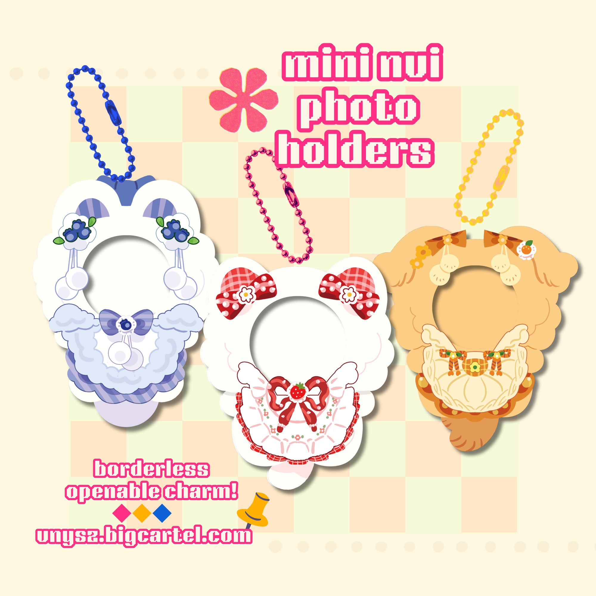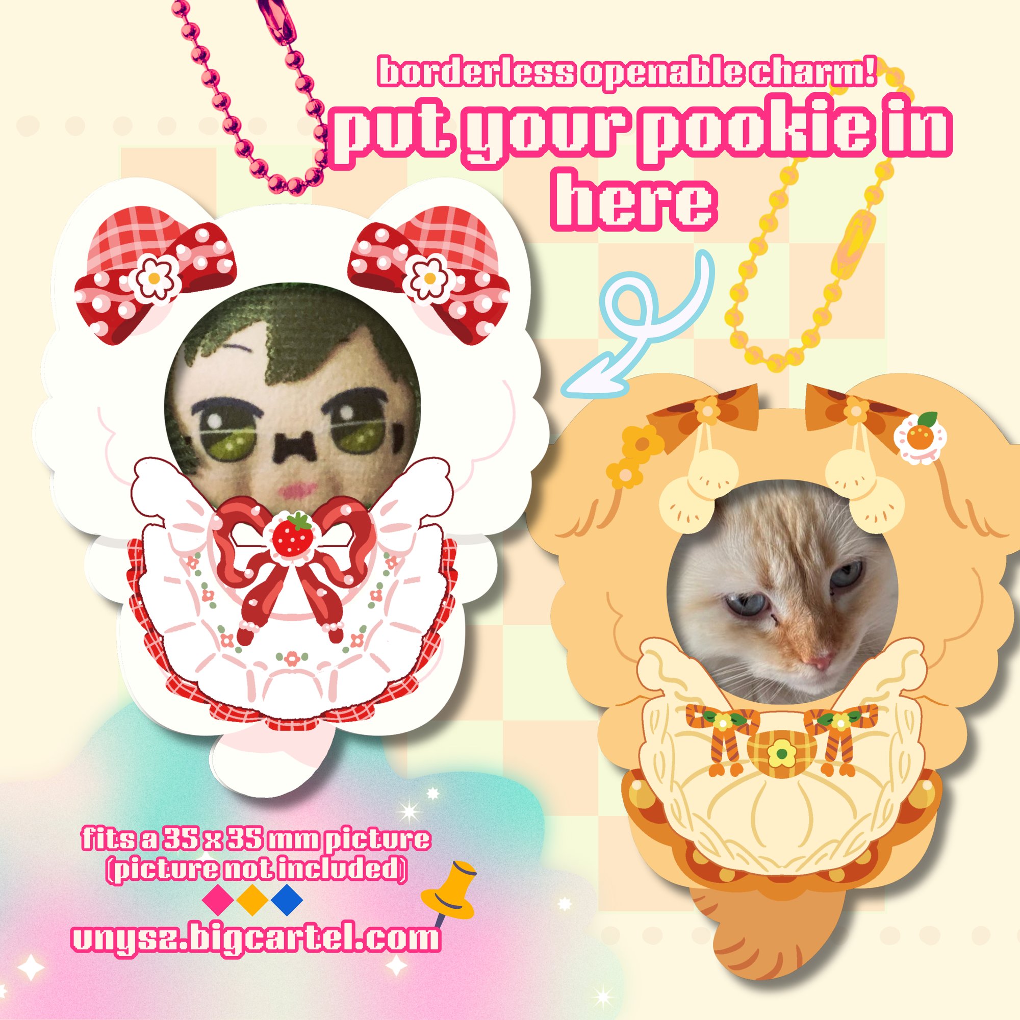 Openable and borderless photo holder charms designed to look like a nui costume!